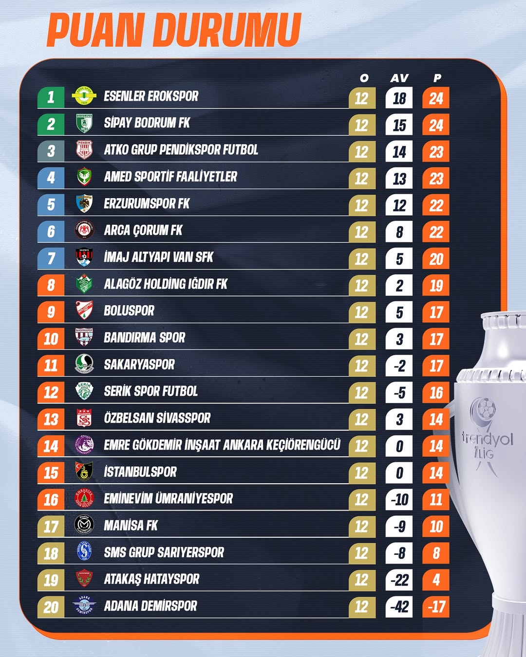 Liderlik yarışında ise dengeler yeniden değişti. Esenler Erokspor, dört haftalık aranın ardından Bodrum FK’dan liderliği averaj farkıyla geri aldı ve yeniden zirveye yerleşti. Bodrum temsilcisi puan kaybıyla birlikte ikinci sıraya gerilerken, ligin dibinde yine Adana ekibi yer aldı. -17 puanda kalan Adana temsilcisi, haftayı son sırada tamamladı.