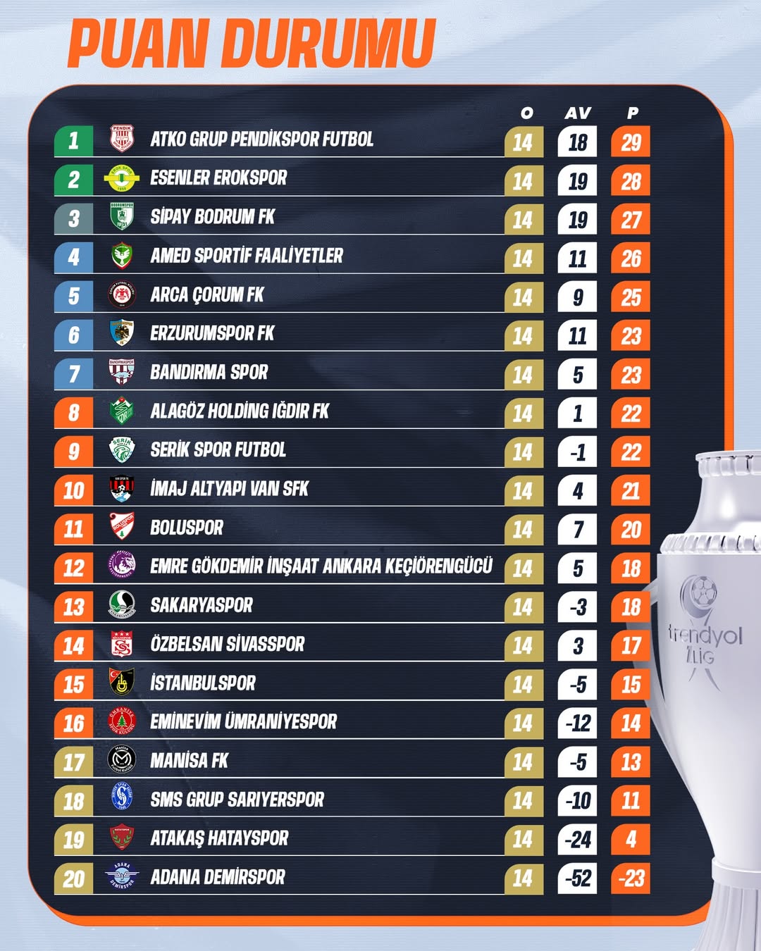 Bodrum FK’nın puan kaybı sonrası zirve el değiştirirken, Pendikspor 29 puanla liderlik koltuğuna oturdu. Ligin dibinde ise Adana Demirspor, -23 puanla son sırada yer aldı.