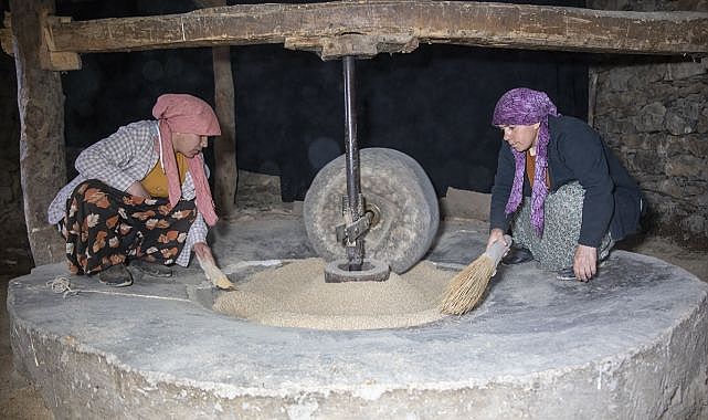 Dağın eteğinden çıkan suyun kanalla getirilmesiyle dönen değirmende, köylülerin getirdiği buğday, arpa, darı ve mısır öğütülerek un haline getiriliyor.