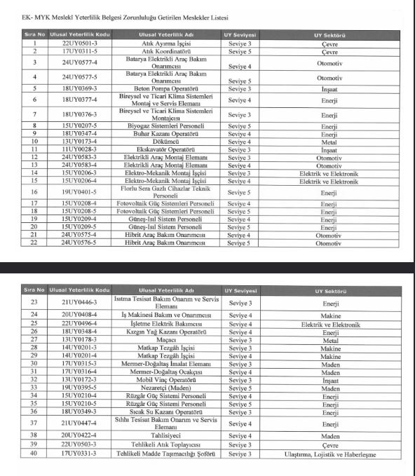 Çalışma ve Sosyal Güvenlik Bakanlığı tarafından yapılan düzenleme kapsamında, Mesleki Yeterlilik Kurumu standartlarına göre belirlenen 40 meslek için mesleki yeterlilik belgesi zorunluluğu getirildi. Resmi Gazete’de yayımlanan tebliğe göre, belgesi bulunmayan ya da muafiyet kapsamında yer almayan kişiler, düzenlemenin yürürlüğe girdiği tarihten itibaren 12 ay sonra bu işlerde çalıştırılamayacak.
