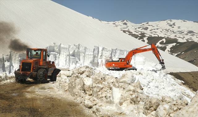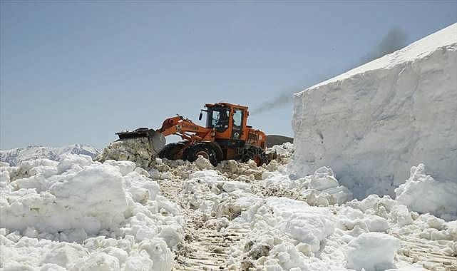 Kentte çetin geçen kış mevsiminin ardından vatandaşların mağduriyet yaşamaması için sorumluluk alanlarındaki yollarda mesai yapan ekipler, kar kalınlığının yer yer 5 metreyi bulduğu yayla yolunda çalışmalarına devam ediyor.