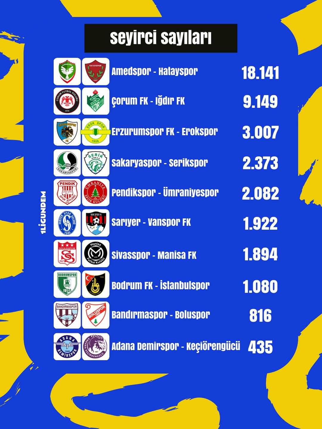 Haftanın diğer karşılaşmalarında da tribünlerde farklı seviyelerde doluluk yaşandı. Sakaryaspor–Serikspor maçını 2 bin 373, Pendikspor–Ümraniyespor mücadelesini 2 bin 82, Sarıyer–Vanspor FK karşılaşmasını 1.922, Sivasspor–Manisa FK maçını ise 1.894 taraftar izledi. Bodrum FK–İstanbulspor maçında 1.080, Bandırmaspor–Boluspor mücadelesinde 816, Adana Demirspor–Keçiörengücü karşılaşmasında ise 435 futbolsever tribünlerde yer aldı.