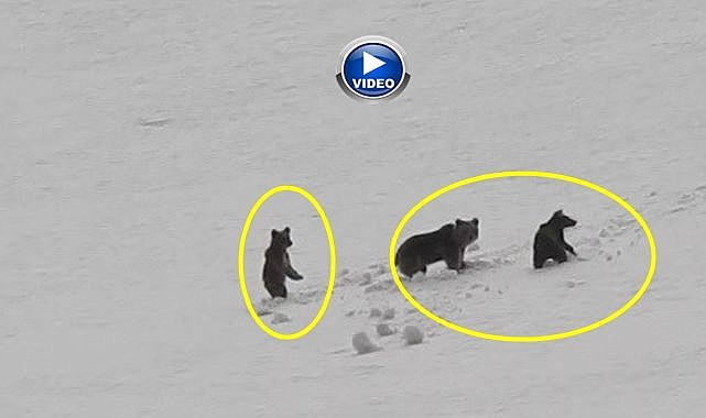 Erzincan’da Munzur Dağları’nda kış uykusundan uyanan anne ayı ve iki yavrusu, karlı arazide yiyecek ararken görüntülendi.