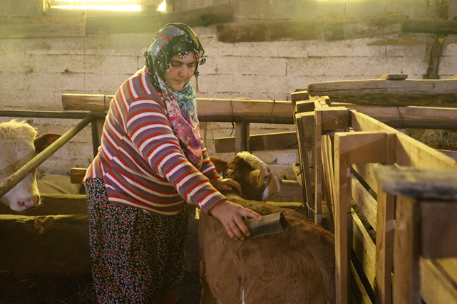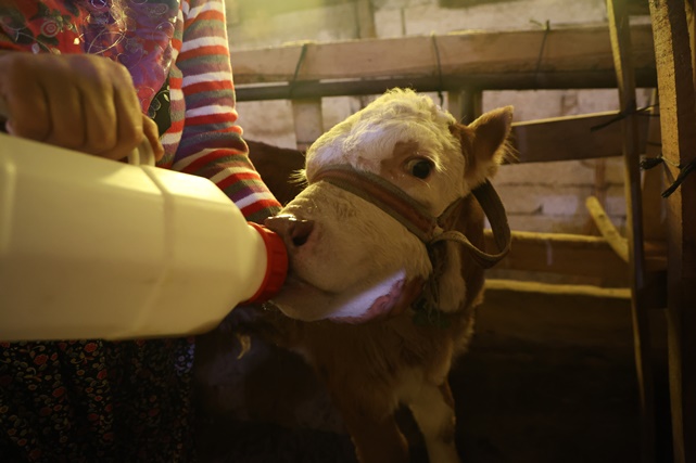 Annesi ölen buzağıyı elleriyle besliyor