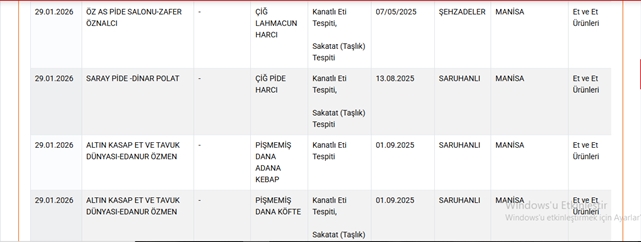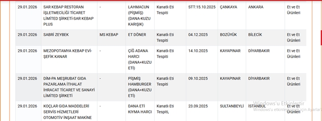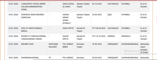 Güncellenen listede sucuk, döner, zeytinyağı, lahmacun, pide, köfte, hamburger, bal, kaşar peyniri ve yoğurt gibi çok sayıda ürün yer aldı. Yapılan incelemelerde, bu ürünlerde mevzuata aykırı içeriklerin kullanıldığı tespit edildi.