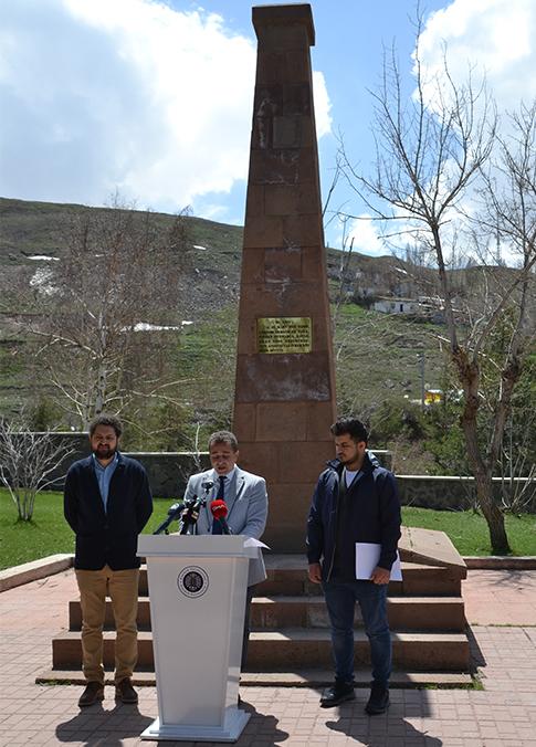 Atatürk Üniversitesi Türk-Ermeni İlişkileri Araştırma Merkezi Müdürü Doç. Dr. Mevlüt Yüksel, Ermeni çeteleri tarafından 1918 yılında katledilen 3 bin Türk'ün anısına merkez Yakutiye ilçesinde yaptırılan Yanıkdere Şehitliği'nde basın toplantısı düzenledi.