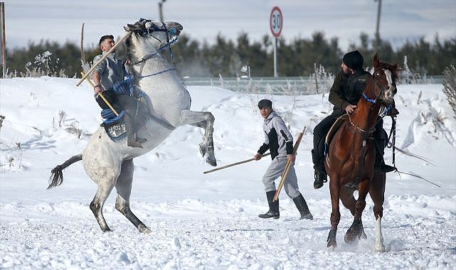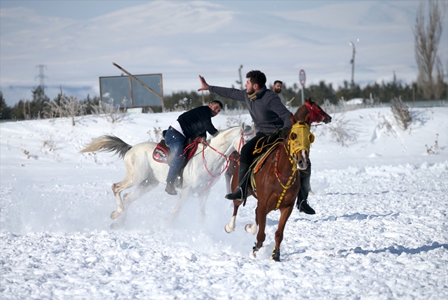 Yüzyıllardır Anadolu'da yaşatılan cirit, Selim ilçesinde bu yıl etkili olan yoğun kar yağışının ardından ata sporunu yaşatmaya çalışan vatandaşların eğlencesi oluyor.