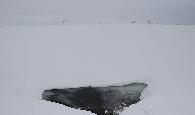 Aylardır yüzeyi karla kaplı olan göl bölgesinde bahar mevsiminde adeta çetin kış koşulları etkili oluyor.