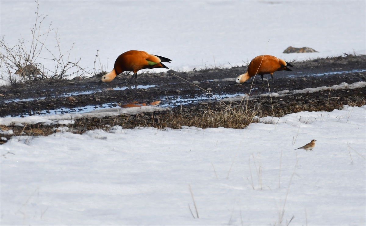 Köy sakinlerinden Kerim Ekinci, AA muhabirine, kar yağışından sonra havaların ısınmaya başladığını belirterek, "Baharın müjdecisi leylekler gelmeye başladı. Yaban kuşları, angutlar artık gelip buralarda beslenmeye başladılar." dedi.