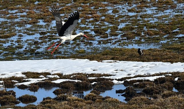 Çayırlık alanda, karların erimesiyle oluşan sulak bölgelerde leyleklerin yanı sıra angut ve kız kuşu gibi göçmen kuşlar da yiyecek ararken objektife yansıdı.