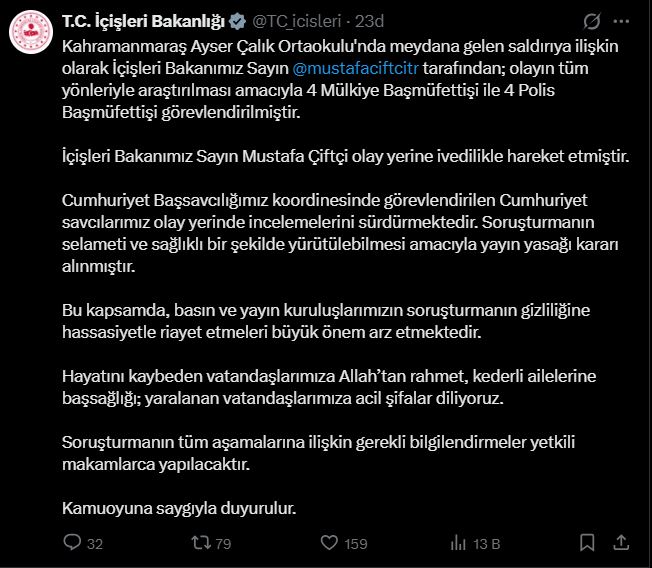 Öte yandan soruşturmanın sağlıklı yürütülmesi amacıyla yayın yasağı kararı alındığı belirtilerek, basın kuruluşlarının bu sürece hassasiyet göstermesi gerektiği ifade edildi.İçişleri Bakanı Mustafa Çiftçi’nin de olay yerine ivedilikle hareket ettiği aktarılan açıklamada, gelişmelerin yakından takip edildiği vurgulandı. Bakanlık, saldırıda hayatını kaybeden vatandaşlara Allah’tan rahmet, yakınlarına başsağlığı, yaralılara ise acil şifalar dileyerek, soruşturmanın tüm aşamalarına ilişkin bilgilendirmelerin yetkili makamlarca yapılacağını duyurdu. Manolya Bulut