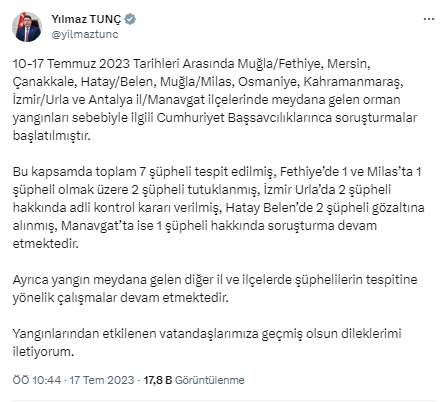 Ayrıca yangın meydana gelen diğer il ve ilçelerde şüphelilerin tespitine yönelik çalışmalar devam etmektedir. Yangınlarından etkilenen vatandaşlarımıza geçmiş olsun dileklerimi iletiyorum.