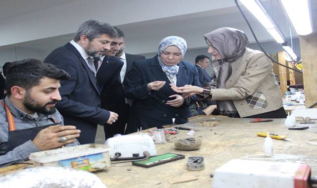 Erzurum'un tescilli ürünü ve simgesi olan "Oltu" taşından ürünlerin yapıldığı Kuyumculuk Teknolojisi Atölyesini gezen Celile Eren Ökten, çalışmaları inceleyerek kurum çalışanlarına teşekkür etti.