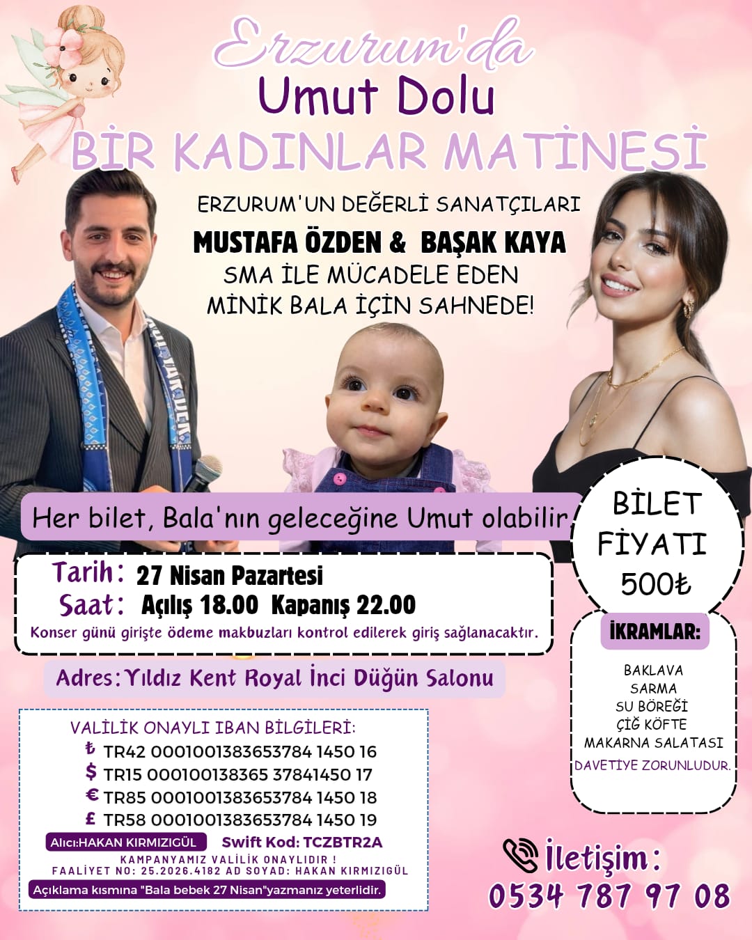 Minik Bala’nın tedavisine katkı sağlamak amacıyla 27 Nisan Pazartesi günü Erzurum’da “Umut Dolu Bir Kadınlar Matinesi” düzenlenecek. Saat 18.00’de başlayacak ve 22.00’ye kadar sürecek etkinlik, Yıldız Kent Royal İnci Düğün Salonu’nda gerçekleşecek. Mustafa Özden ve Başak Kaya’nın sahne alacağı gecenin biletleri 500 TL’den satışa sunuldu.