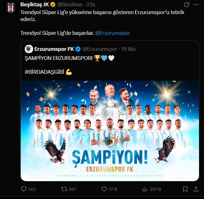 Beşiktaş JK, resmi sosyal medya (X) hesabı üzerinden paylaştığı mesajla Erzurum ekibini kutladı. Siyah-beyazlı kulüp paylaşımında şu ifadelere yer verdi: