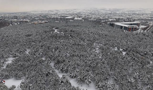 Elazığ'da kar yağışının ardından oluşan görüntüler, bu kez yüksek rakımlı dağlardan değil, şehrin merkezinden geldi. Beton binaların ve ana arterlerin çevrelediği Fırat Üniversitesi kampüsü içindeki ormanlık alan, kar yağışıyla birlikte şehir merkezinde dev bir kış bahçesine dönüştü. Genellikle kentin yüksek kesimlerinde görmeye alışık olunan yoğun kar manzaraları, bu kez Elazığ'ın en işlek noktalarından biri olan Zübeyde Hanım Caddesi'nin hemen yanı başındaki ormanlık alanda kaydedildi. Kültür Park'ın modern dokusuyla birleşen ormanlık alan, havadan görüntülendi. Dağ yollarını aratmayan kar yoğunluğunun şehrin göbeğinde sergilediği bu anlar, nadir kareler oluşturdu.