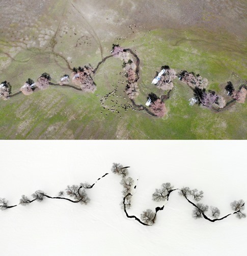 Muş Ovası’nda ağaçların arasındaki mendereslerin ilkbahar ve kış mevsimlerinde havadan aynı noktadan görüntülenmesi kartpostallık manzaralar oluşturdu. Havadan görüntülenen ağaçlar ve menderesler, doyumsuz bir seyir sunuyor.