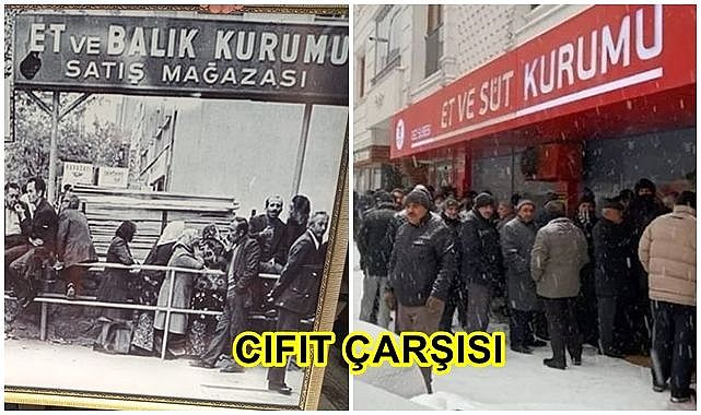 1960’lı yılların başlarında Et ve Süt Kurumu olarak da bilinen kombina satış mağazalarında başlamış bu kuyruklar. Yıllar geçtikçe kurum yenilenmiş, hatta ismi bile değişmiş ama mağazalarının önünde ki kuyruklar hiç değişmemiş. Fotoğrafına yer verdiğimiz kuyruk, bugün ki kuyruklardan farksız. Yer, mevsim önemli değil. Ha Ankara, ha Erzurum, hiç farketmiyor. 1969 yılında Ankara’da Et ve Balık Kurumu EBK’nın önünde biriken ve Erzurum İl Müdürlüğü’nin hizmet binasının birinci katında da asılı bulunan et kuyruğunun fotoğrafı, bize aslında bu kuyrukların tarih boyunca hep olduğunu da gösteriyor.