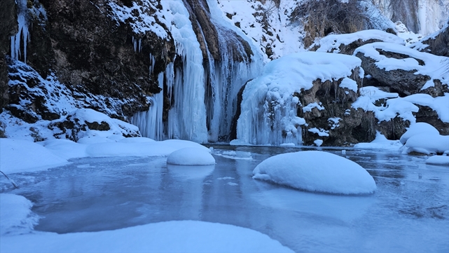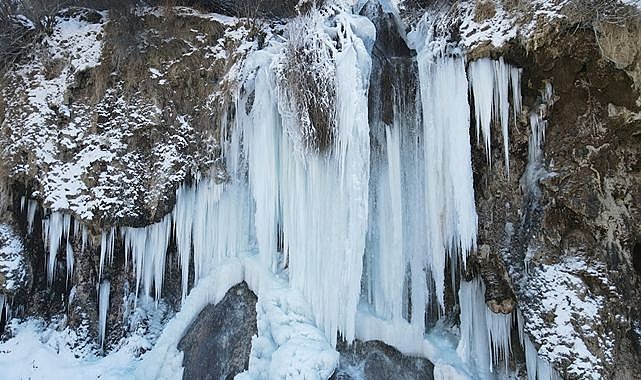 Uzun buz sarkıtlarının oluştuğu şelale, ziyaretçilerini kış güzelliğiyle ağırlıyor.