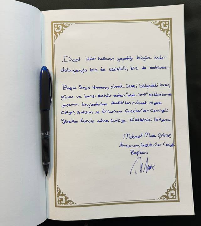 Erzurum Gazeteciler Cemiyeti Başkanı Çakır, İran İslam Cumhuriyeti Başkonsolosluğu’nda açılan taziye defterine ise, şunları yazdı: “Dost İran halkının yaşadığı büyük keder dolayısıyla biz de üzüntülü, biz de mahzunuz…