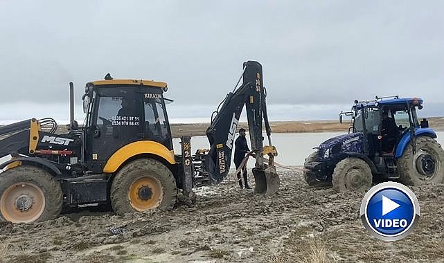 Çamura saplanan traktör kepçe ile kurtarıldı