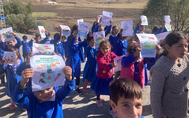 Öğrenciler, Filistin farkındalık etkinlikleri kapsamında kendi boyadıkları Filistin bayrakları ve çizdikleri resimlerle köyde sessiz yürüyüş yaptı.