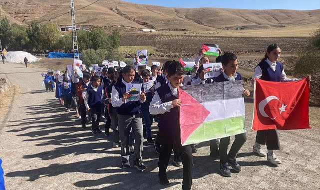 Ellerinde Türk ve Filistin bayrakları taşıyan öğrencilere, köy halkı destek verdi.