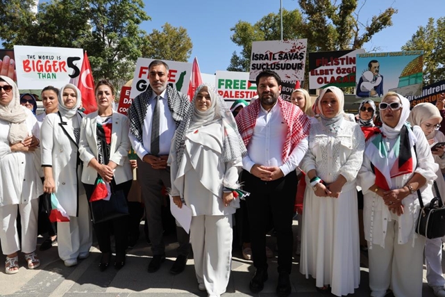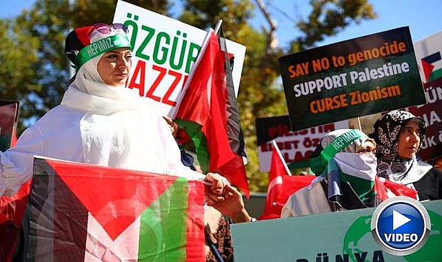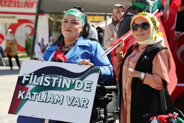 Kadınlar, ellerinde "Katil İsrail" ve "Özgür Filistin" yazılı döviz ve pankartlarla Gazze halkına destek verirken, etkinlikte Gazze'de yaşanan insanlık dramına dikkat çekildi.