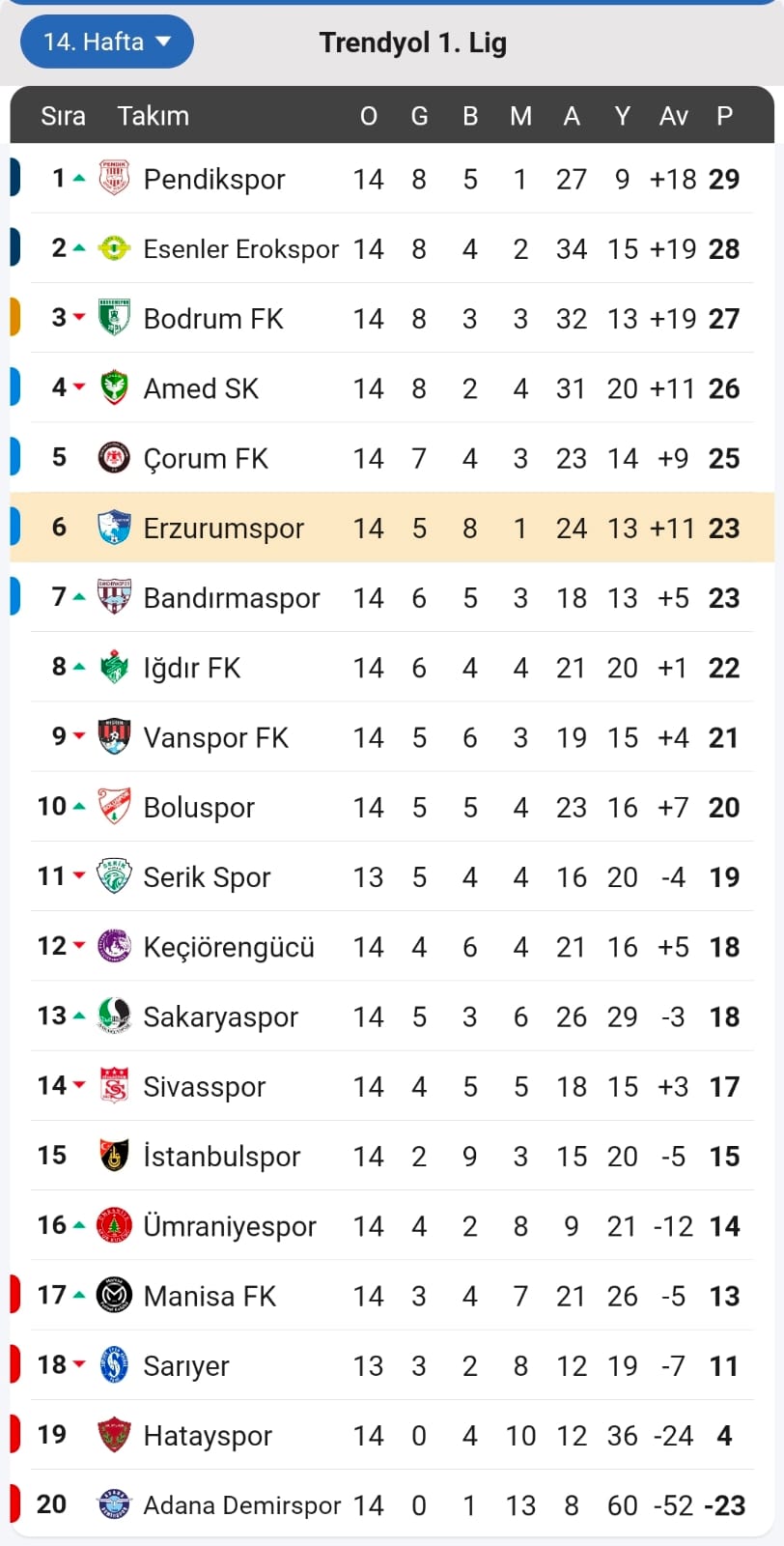 Erzurumspor FK, 5 galibiyet, 8 beraberlik ve 1 mağlubiyetle 23 puanda kalarak ligde 6. sıraya yerleşti. Zirvedeki Pendikspor ile arasındaki fark 6 puana çıkarken, 10. sıradaki Boluspor ile fark sadece 3 puan. Bu tablo, ilerleyen haftalarda alınacak her beraberlik ya da mağlubiyetin Dadaşları ilk 7 potasının dışına itme riskini taşıdığını gösteriyor. Öte yandan alınacak bir galibiyet serisi ise takımı çok kısa sürede ilk 3 yarışının tam içine atabilecek potansiyele sahip.