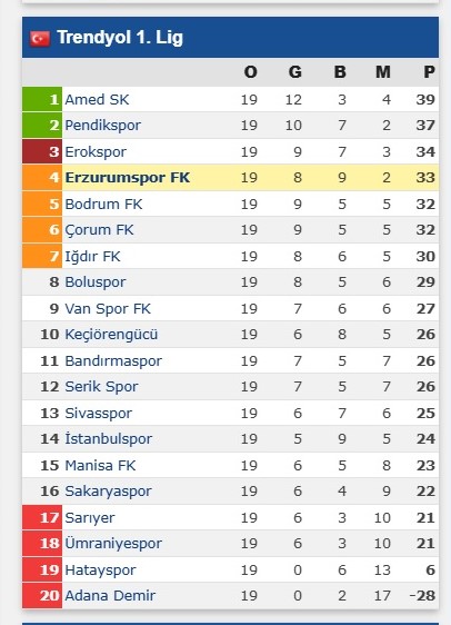 Erzurumspor FK, sezonun ilk yarısını 8 galibiyet, 9 beraberlik ve 2 mağlubiyet alarak 33 puanla 4. sırada tamamladı. Sezon başından bu yana 3 ile 7. sıralar arasında yer alan mavi-beyazlılar, bu periyotta istikrarlı bir grafik çizdi. Ligin ilk 13 haftasını namağlup geçen dadaşlar, ilk yarıyı da zirve yarışından kopmadan tamamladı.