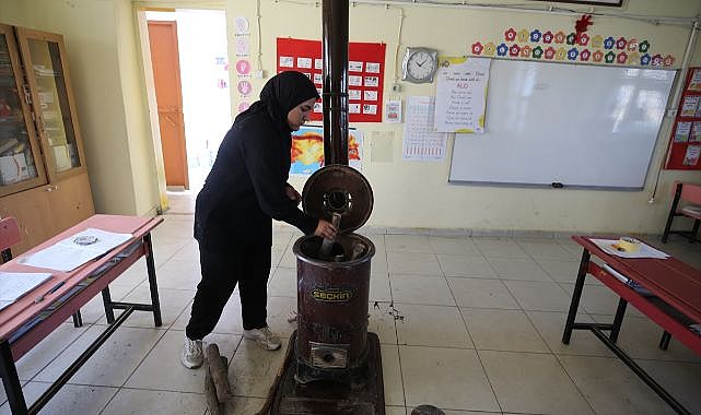 Çökdel, dağın yamacında kurulu köy okuluna servisle gelip, ardından soba yakarak ısıttığı sınıfta 18 öğrencisi için sıcak bir eğitim ortamı oluşturuyor.