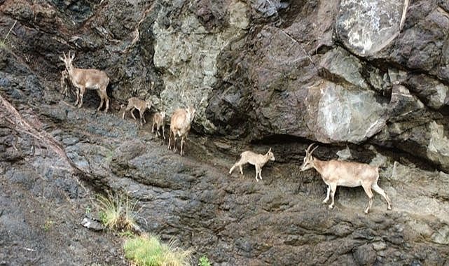 Narman yolu üzerindeki Damlıca Yaban Hayatı Koruma Sahası'nda yaban keçileri görüntülendi. Hem doğaseverlerin dronla kayda aldığı hem de yoldan geçen sürücülerin cep telefonlarıyla çekim yaptığı yaban keçileri, doğal yaşamın güzelliğini bir kez daha gözler önüne serdi.