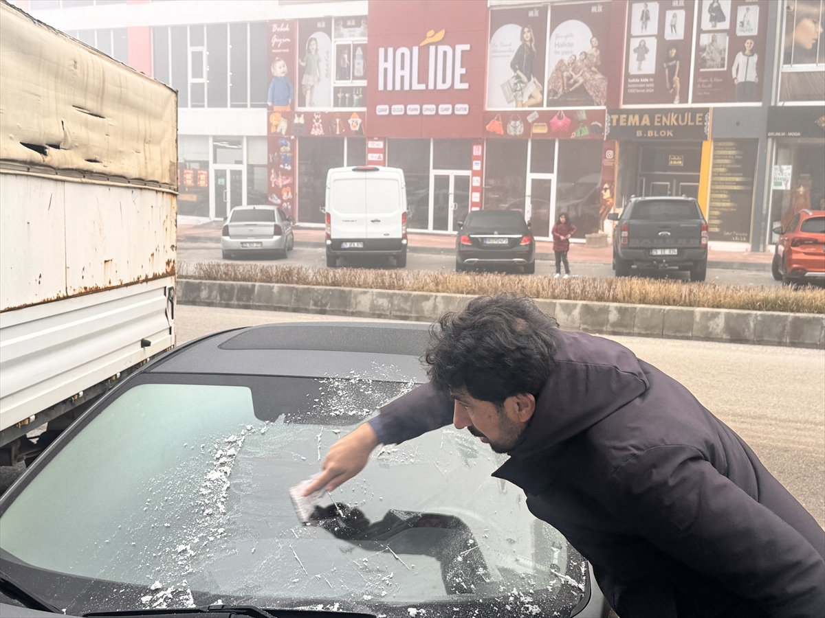 Vatandaşlar buz tutan araçların camlarını kazıcı yardımıyla çözmeye çalıştı.