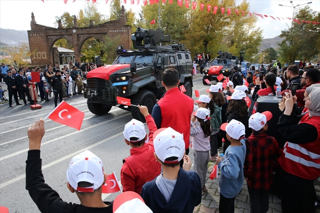 Cumhuriyet Meydanı'nda düzenlenen programda Vali Ahmet Karakaya, Belediye Başkan Nesrullah Tanğlay ve Tatvan 10. Komando Tugay Komutanı Tuğgeneral Tahir Kılıç, askeri araçla vatandaşların ve tören birliklerinin bayramını kutladı.