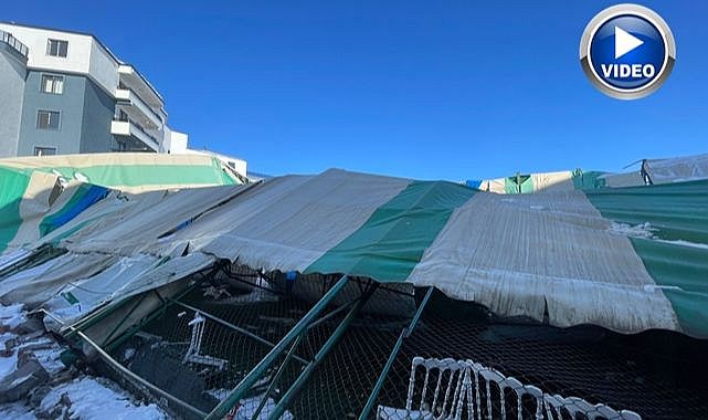 Iğdır'ın Tuzluca ilçesinde düğün salonu olarak kullanılan halı saha, günlerdir etkili olan kar yağışının ardından çöktü.