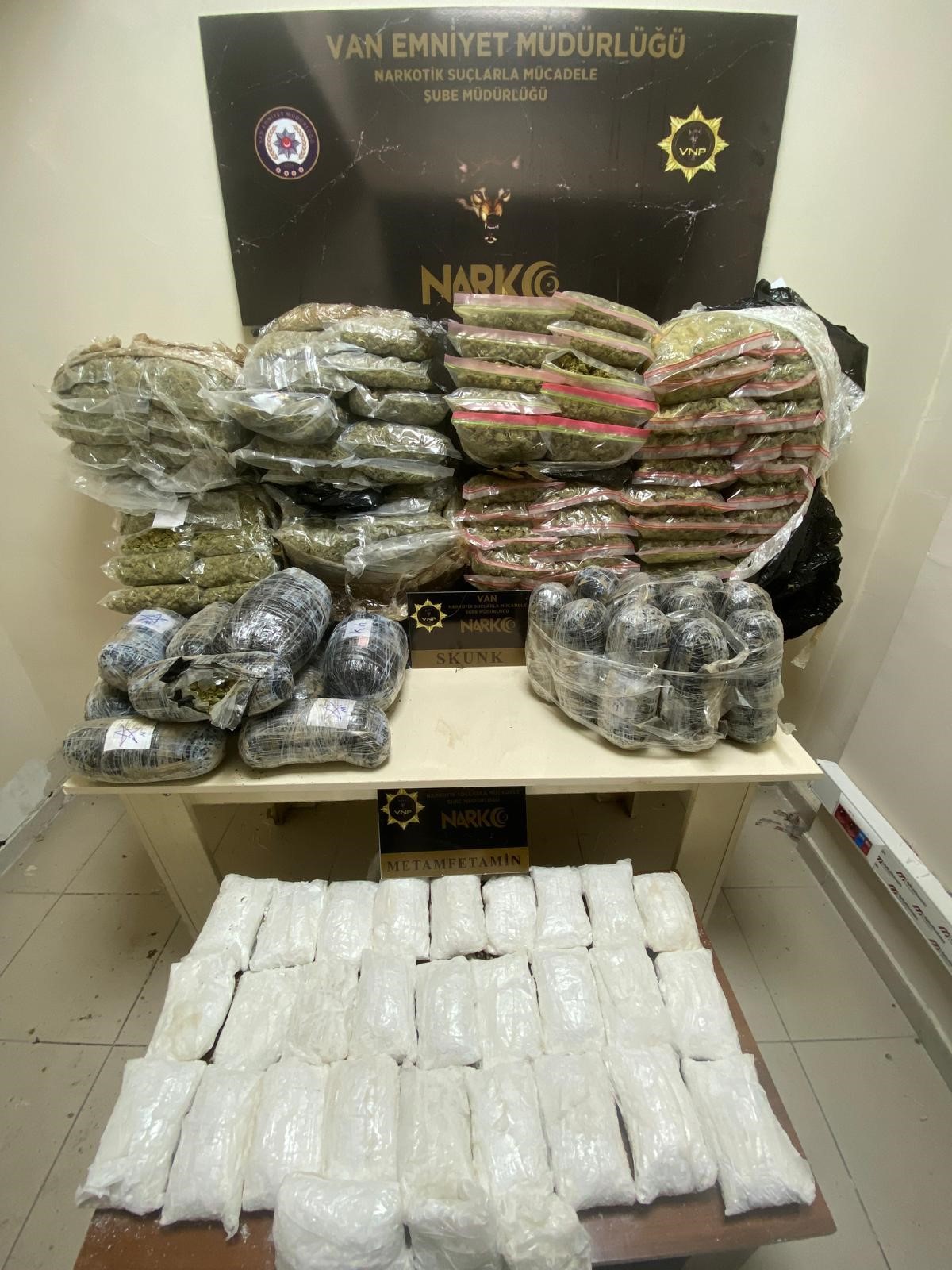 Açıklamada, "Narkotik Suçlarla Mücadele Şube Müdürlüğü görevlilerimizce 12 - 19 Nisan 2026 tarihleri arasında yapılan çalışmalar neticesinde; 57 kilo 700 gram skunk, 31 kilo 480 gram metamfetamin, 254 gram eroin, 162,92 litre asetik anhidrit maddesi ele geçirilmiştir.