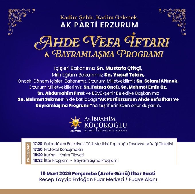 atanmasının ardından Ramazan ayının son iftarını Erzurum’da yapacak. “Ahde vefa” temasıyla düzenlenecek iftar ve bayramlaşma programına, Milli Eğitim Bakanı Prof. Dr. Yusuf Tekin de katılacak. Aslen Erzurumlu olan Bakan Tekin’in de yer alacağı buluşma, kentte geniş katılımla gerçekleşecek.