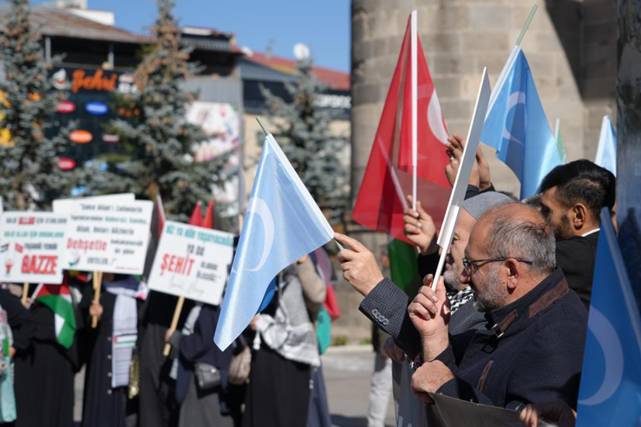 Yakutiye Kent Merkezi’nde bulunan Lala Mustafa Paşa Camisi önünde bir araya gelen sağlık çalışanları; Türk, Filistin ve Doğu Türkistan bayrakları eşliğinde taşıdıkları döviz ve pankartlarla Yakutiye Medresesi'ne kadar yürüdü.