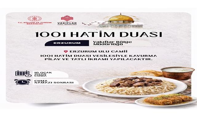Erzurum Vakıflar Bölge Müdürlüğü’nün ev sahipliğinde gerçekleştirilecek olan 1001 Hatim Duası programı, Erzurum Ulu Cami’nde 16 Ocak 2026 Cuma günü, Cuma namazının ardından yapılacak. Yetkililer, tüm Erzurum halkını programa davet etti.