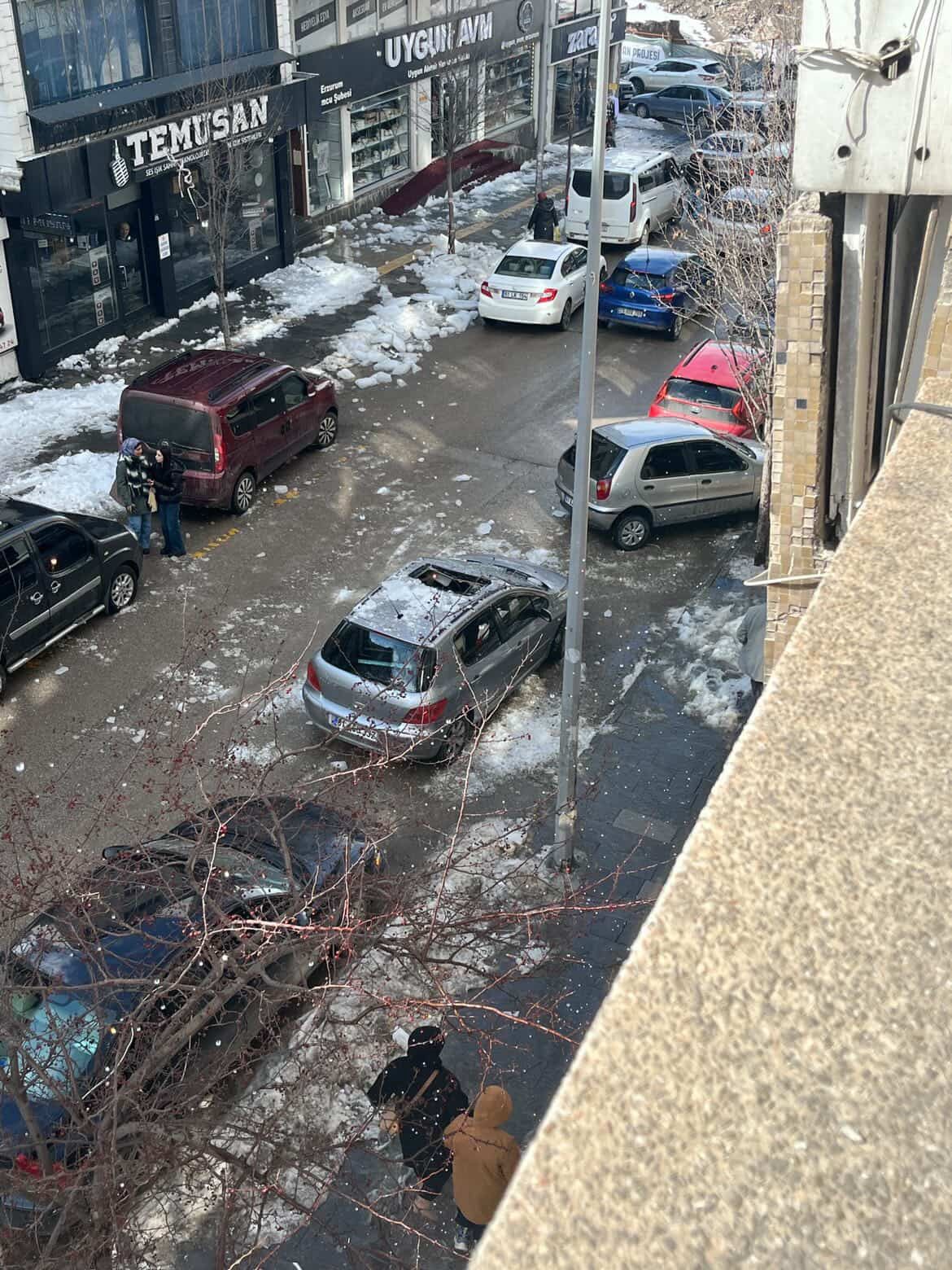5 katlı bir apartmanın çatısında biriken buz kütleleri hava sıcaklığının artmasıyla koparak cadde üzerine düştü. Park halindeki iki otomobilin üzerine isabet eden buz parçaları araçlarda hasara yol açtı. O sırada çevrede insanların bulunması ise olası bir facianın son anda atlatıldığını ortaya koydu.
