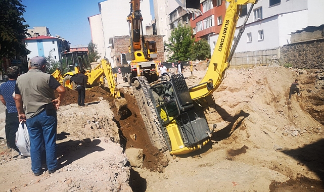 Erzurum şehir merkezinde bir binanın temel hafriyatının alınması esnasında iş makinesinin aniden devrilmesi ve ters dönmesi herkesi korkuttu.