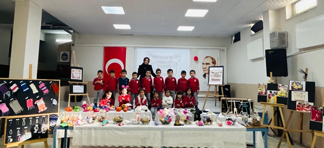 Öğretmen Özlem Yahşi Anik rehberliğinde yürütülen proje kapsamında minik öğrenciler, kendi emekleriyle hazırladıkları ürünleri okulda açılan sergide beğeniye sundu. Velilerin de katkılarıyla güçlenen proje süresince çocuklar; geri dönüştürülebilir ve günlük hayatta kullanılan materyallerden, atkılar, kilimler, değnek adamlar ve çeşitli el işi ürünleri hazırladı.