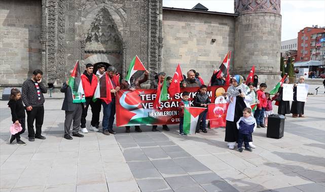 Tarihi Lalapaşa Camisi önünde toplanan grup, ellerinde taşıdıkları Türk ve Filistin bayrakları ile İsrail aleyhine yazıların yer aldığı pankartlarla Yakutiye Medresesi'ne yürüdü.