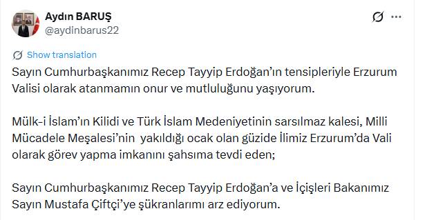 Baruş’un paylaşımı kısa sürede çok sayıda beğeni ve tebrik mesajı aldı. Erzurum’da göreve başlaması beklenen yeni valinin önümüzdeki günlerde devir teslim töreniyle görevi devralacağı öğrenildi.