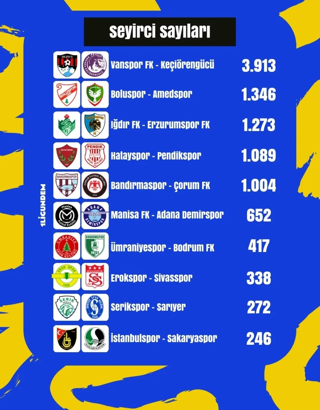 Iğdır FK–Erzurumspor FK karşılaşması ise 1.273 seyirciyle haftanın üçüncü en fazla izlenen mücadelesi olarak kayda geçti.