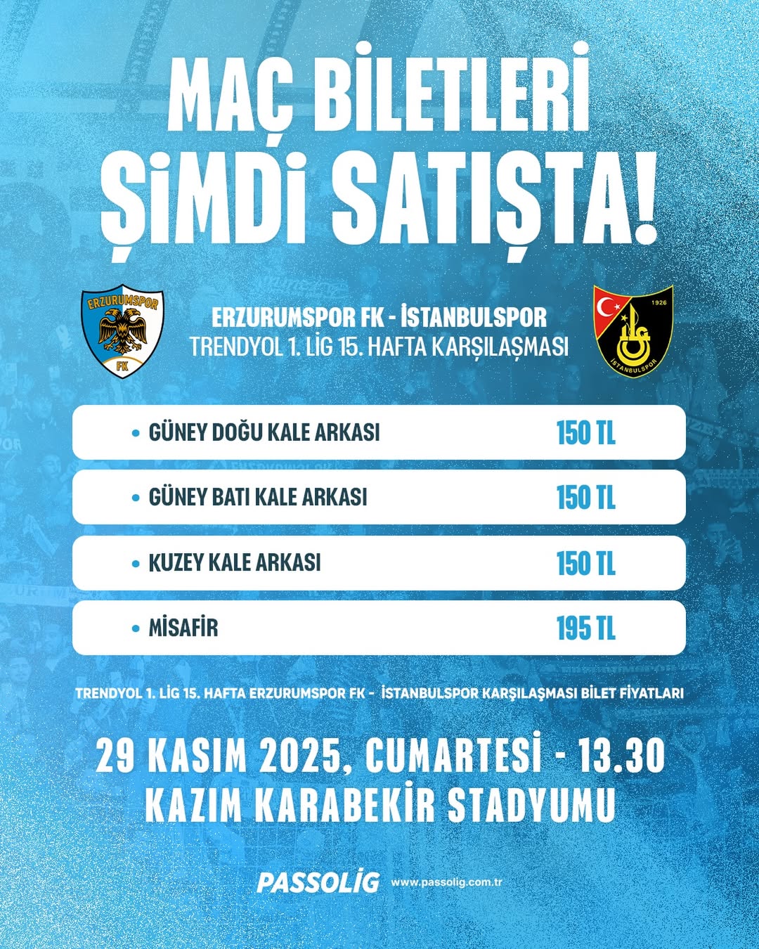 Erzurumspor FK ve İstanbulspor Trendyol 1. Lig’in 15. haftasında 29 Kasım Cumartesi günü saat 13.30’da Kazım Karabekir Stadyumu’nda oynanacak olan maçın biletleri satışa çıktı.