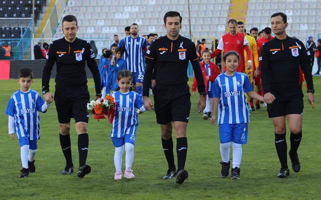 Erzurumspor ve Ümraniyeli futbolcular, Kazım Yurdalan TOKİ Ortaokulu öğrencileriyle birlikte seremoniye çıkarken, hakemlere destek amacıyla çiçek verdi.