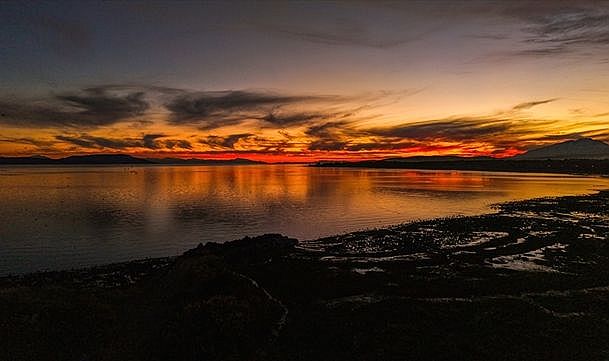 Kırmızının ve gümüşün mükemmel uyumu Gün batımının turuncu ve kırmızı tonları, batı ufkunu bir tablo gibi boyarken, doğu tarafından yükselen ay, gökyüzüne gümüşi ve soğuk bir ışık yaydı. Ay'ın evresinin dolunaya yakın olduğu ve atmosferin belirli bir berraklıkta olduğu zamanlarda bu denli net görülebiliyor.
