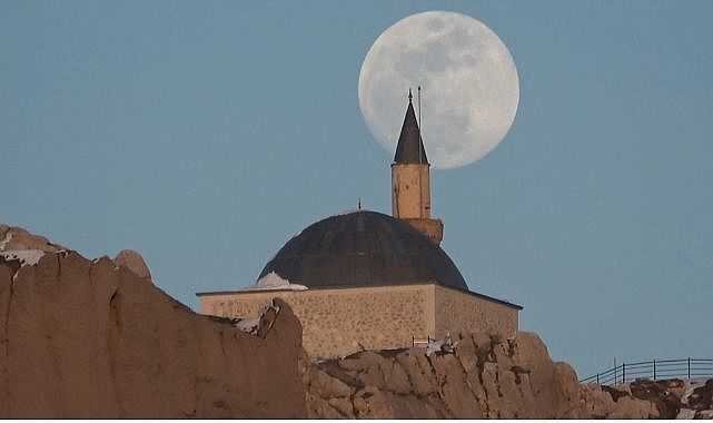 Türkiye'nin en doğusunda, güneşin en görkemli veda ettiği şehirlerden biri olan Van'da, bugün de gökyüzü nöbeti büyük bir zarafetle devredildi. Van Gölü'nün uçsuz bucaksız maviliği üzerinde batan güneş, yerini gecenin sultanı aya bıraktı. Güneşin ufuk çizgisinin altına inmesiyle birlikte, nöbeti devralan ay, Erek Dağı'nın üzerinden tüm heybetiyle yükseldi. Gökyüzünün derin maviliğinde parlayan ay, geceyi aydınlattı.