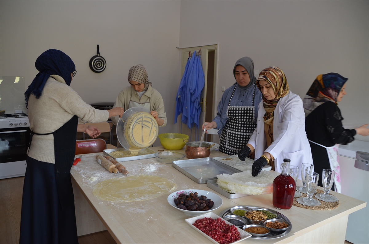 Halk Eğitimi Merkezi Müdürlüğünce Şehit Davut Karaçam Kız İmam Hatip Lisesinde açılan kursa katılan kadınlar, yöreye özgü tatlıların yapımını uygulamalı olarak öğreniyor.